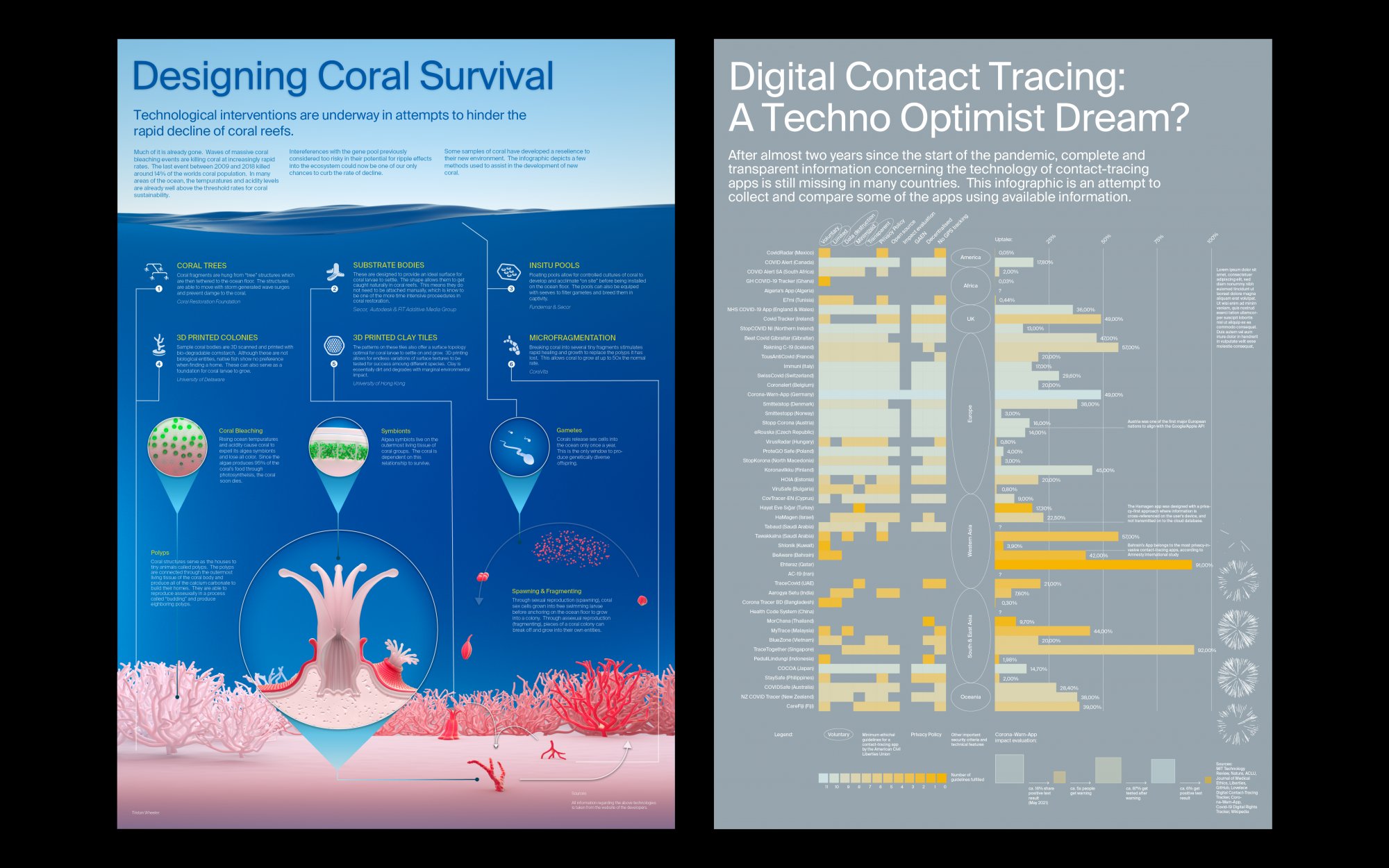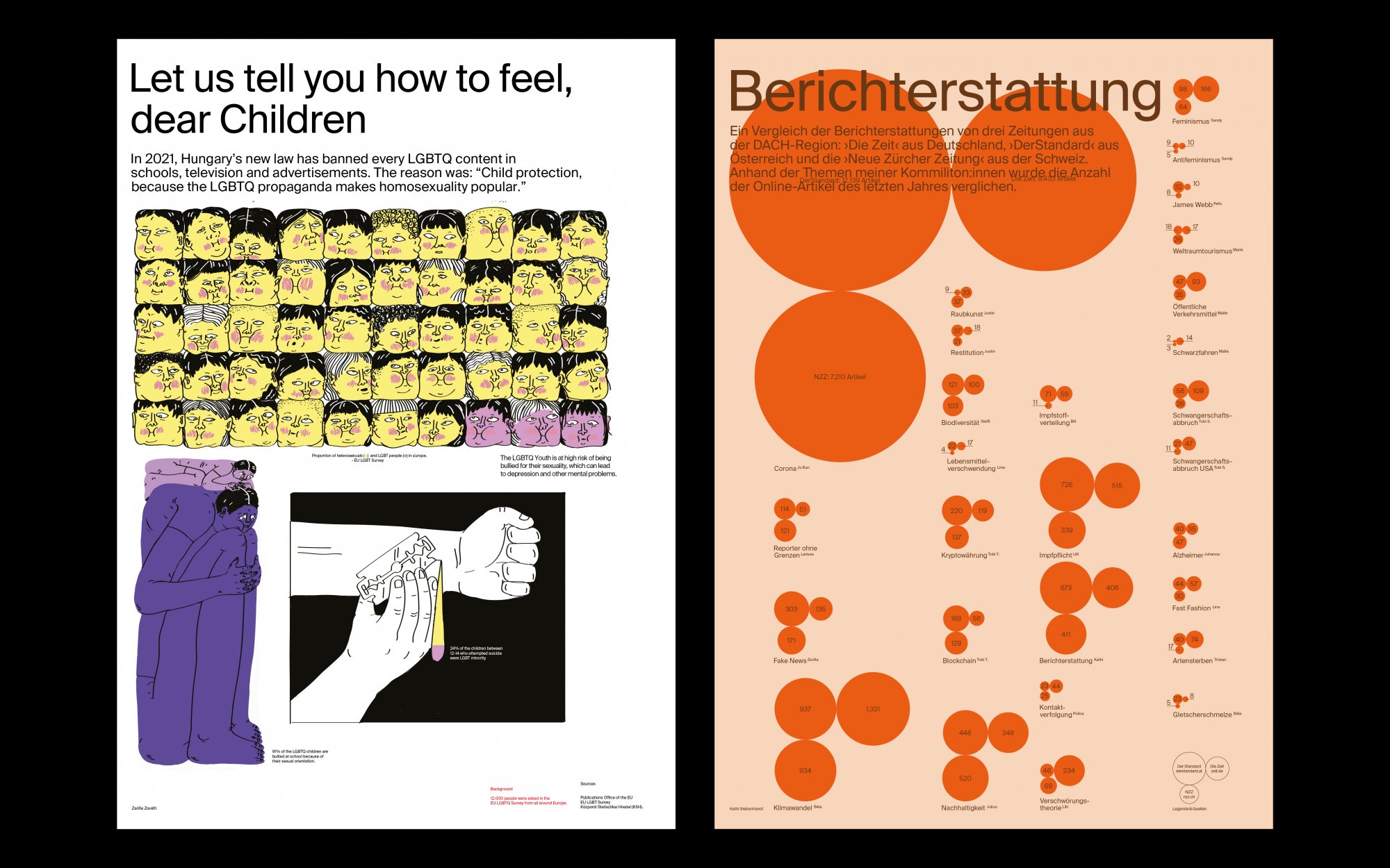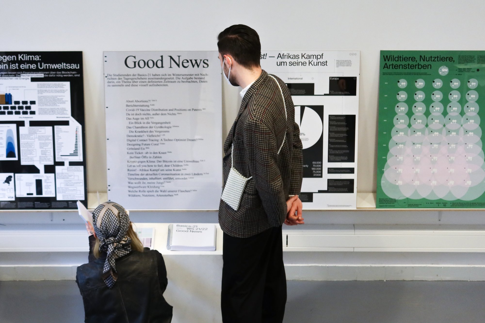 Als Grundlage für das Semesterprojekt „Good News“ setzen sich die Basics-21 über das Wintersemester hinweg mit der Informationsflut an Nachrichten auseinander, welche das gegenwärtige Weltgeschehen skizzieren und festhalten. Dabei erstellen die Studierenden eine Sammlung von Daten, die den Ausgangspunkt bildet für eine thematische Aufbereitung: Komplexe Vorkommnisse und Datensätze werden in eine verständliche visuelle sowie inhaltliche Sprache übersetzt und im Format eines Informationsplakats inszeniert.